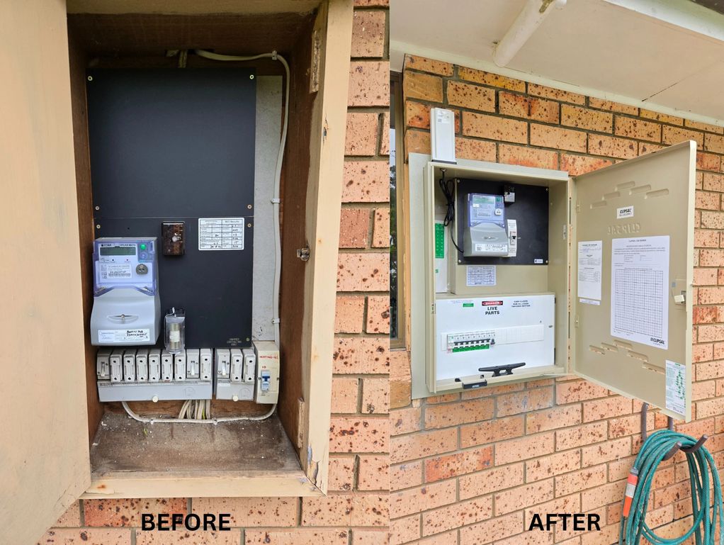 This existing switchboard was beyond repair, so with some left over bricks on site and a small flashing for the new panel it fit in position perfectly to upgrade the installation to make the home safer over all.